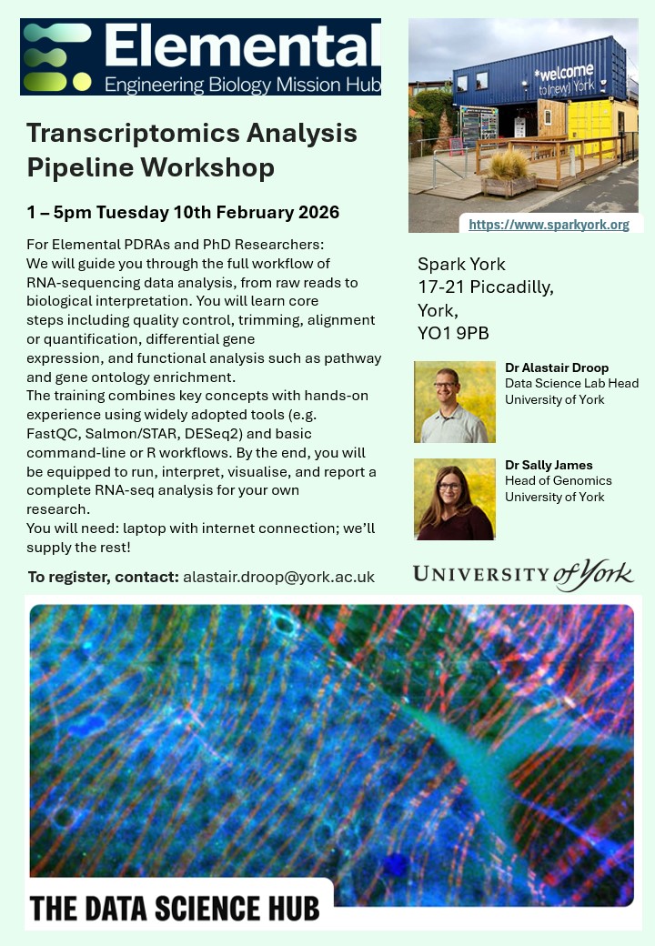 The ELEMENTAL Hub is running a hands-on introduction to RNA-sequencing data analysis, free to members and open to others at a cost of £100. The session will provide a walk through the complete RNA-seq workflow, from raw reads to biological interpretation. Topics include: